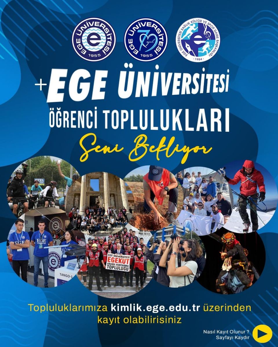DEĞERLİ ÖĞRENCİLERİMİZ, Üniversitemiz Sağlık Kültür ve Spor Daire Başkanlığı’na bağlı olarak faaliyetlerini sürdüren öğrenci topluluklarımıza kayıt işlemleri kimlik.ege.edu.tr üzerinden devam etmektedir